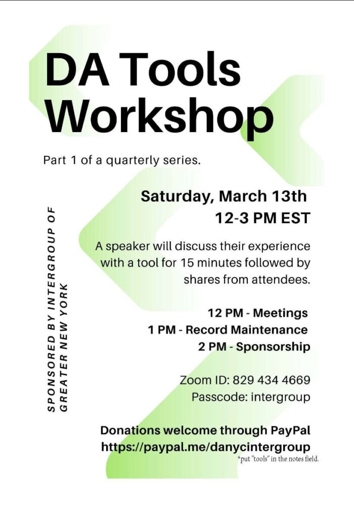 This Saturday, March 13 the Intergroup of Greater New York will be sponsoring a DA Tools Workshop from 12 – 3 PM EST.